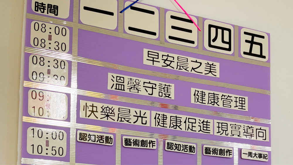 稻香日照中心牆上貼著長者一週的功課表,有復能、認知、藝術、園藝治療課、音樂、卡拉OK等課程;電腦螢幕牆秀出每一位長輩每天進入日照中心的體溫、誰的牙齒不好、誰吃素、誰今天沒來;配餐區的餐盤,貼上每位長者的大名和客製餐點。黃美淑想讓日照中心成為長輩喜歡的地方,成為長輩家屬安心的地方,成為重新感動的地方。